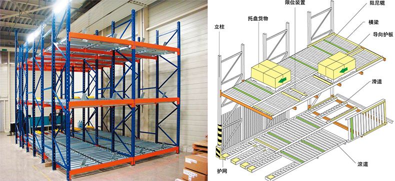 重力式貨架又叫輥道式貨架,屬于倉儲貨架中的托盤類存儲貨架。重力式貨架是橫梁式貨架衍生品之一,貨架結(jié)構(gòu)與橫梁式貨架相似,只是在橫梁上安上滾筒式軌道,軌道呈3-5°傾斜。托盤貨物用叉車搬運(yùn)至貨架進(jìn)貨口,利用自重,托盤從進(jìn)口自動滑行至另一端的取貨口。重力式貨架屬于先進(jìn)先出的存儲方式。